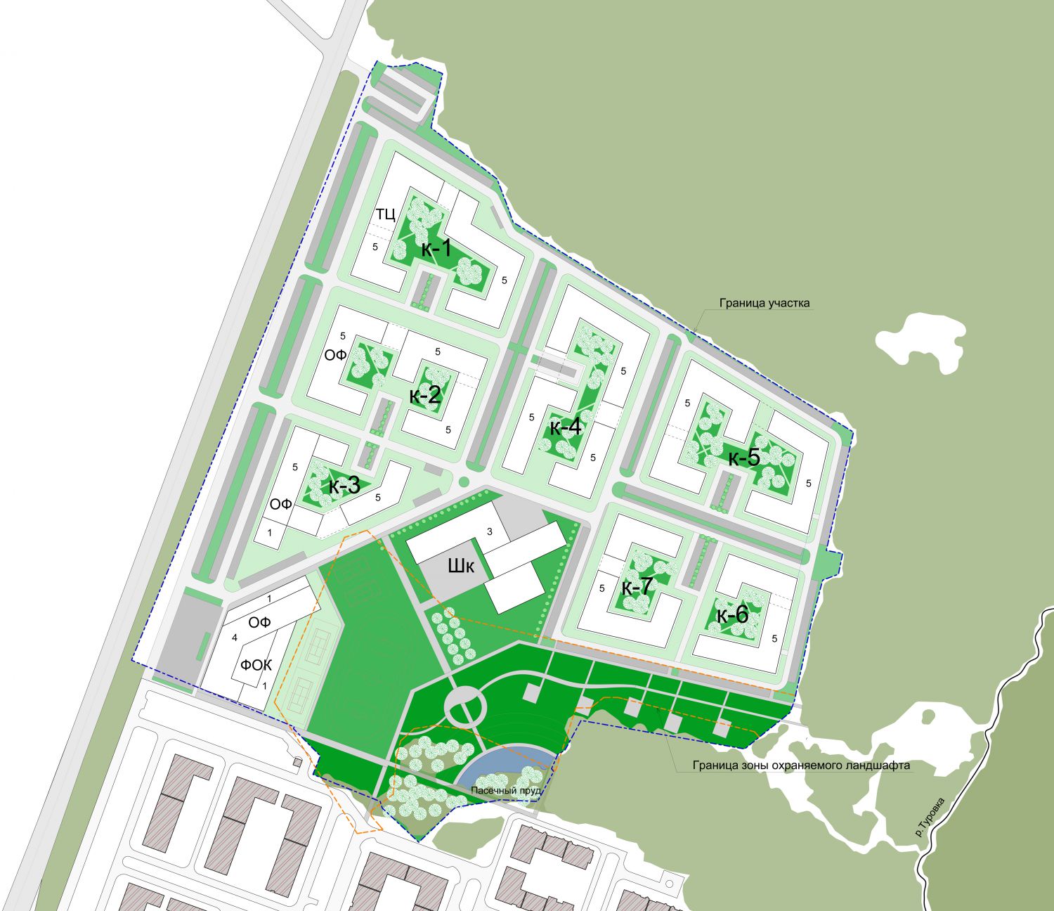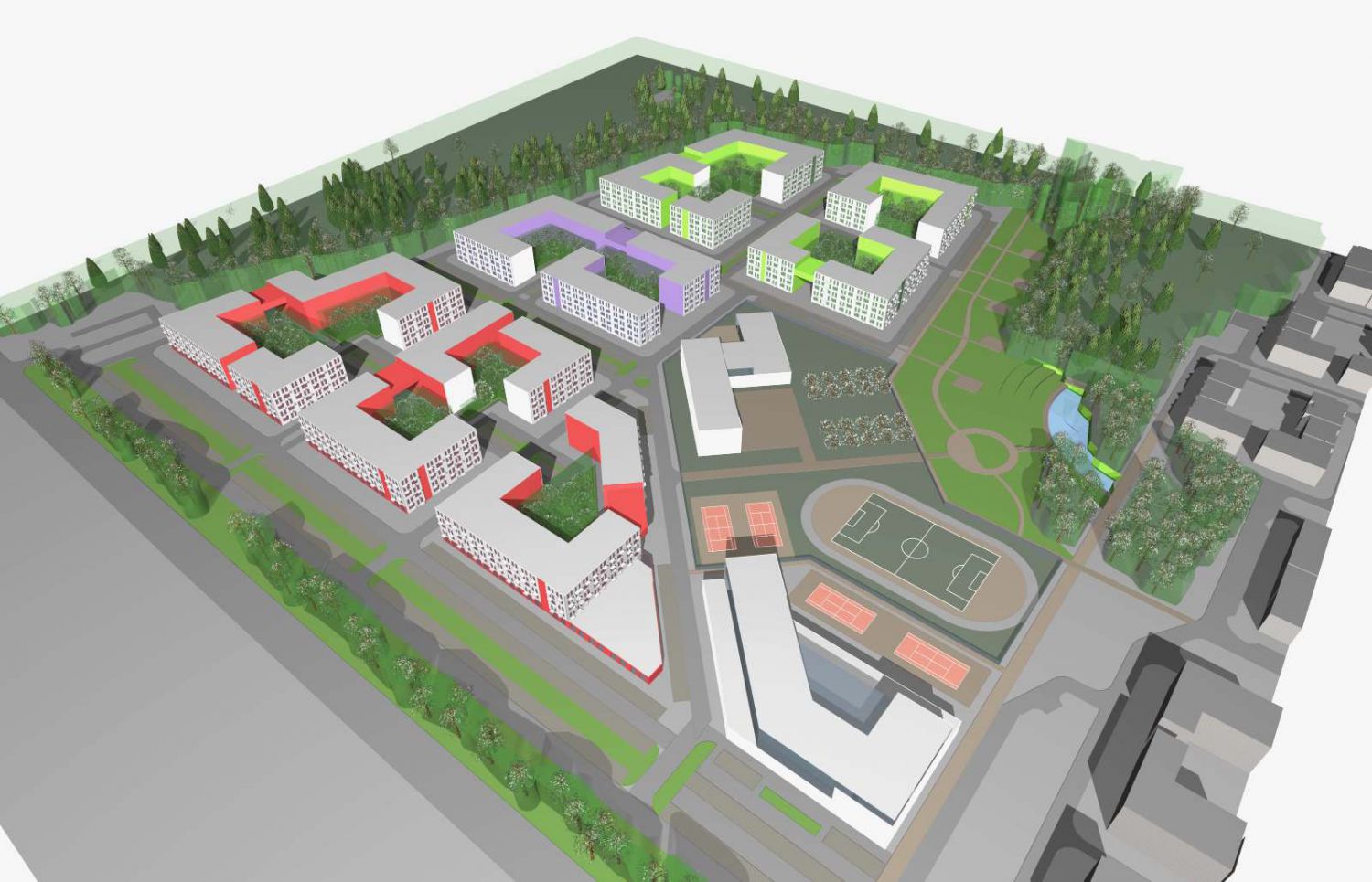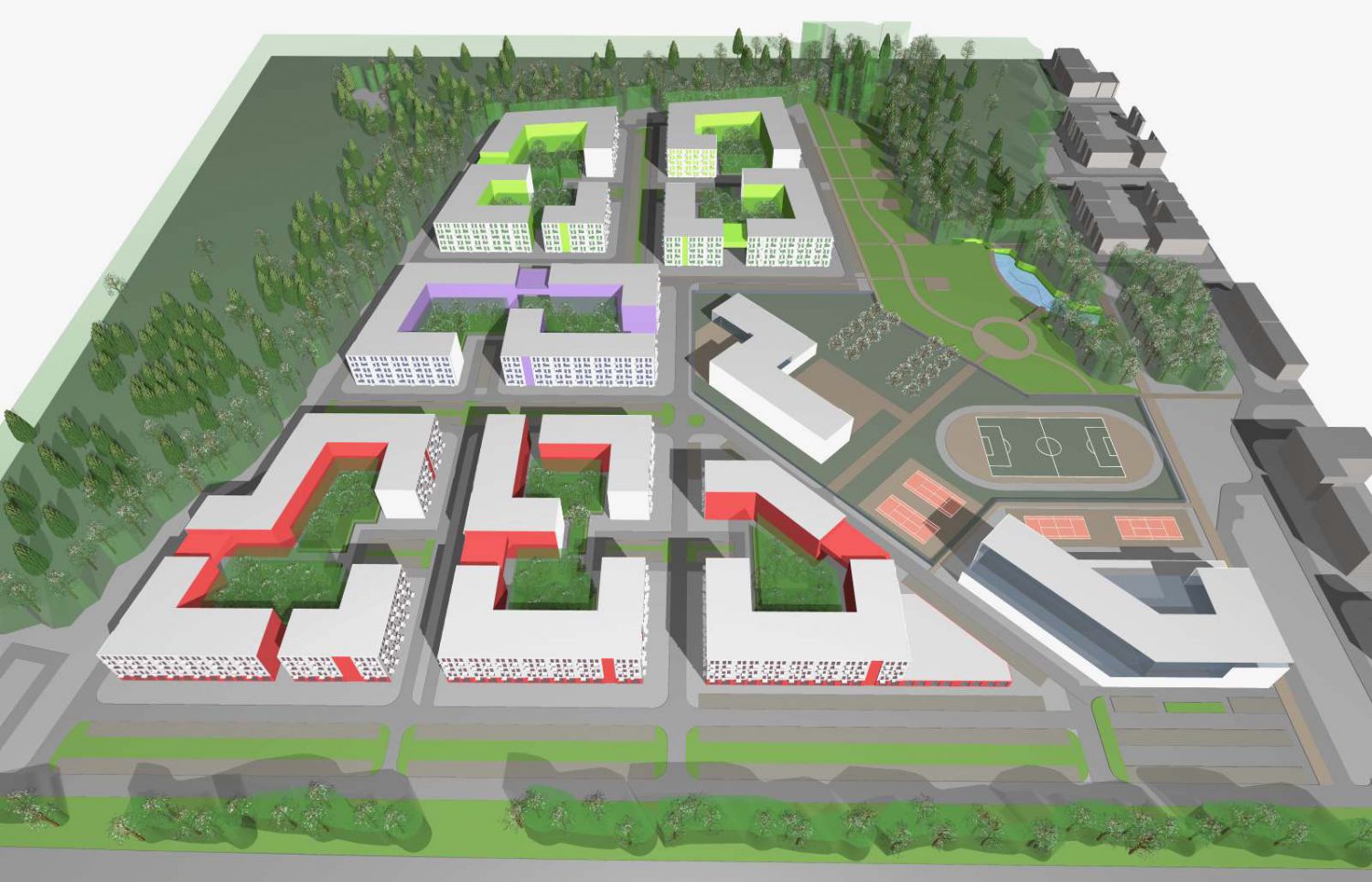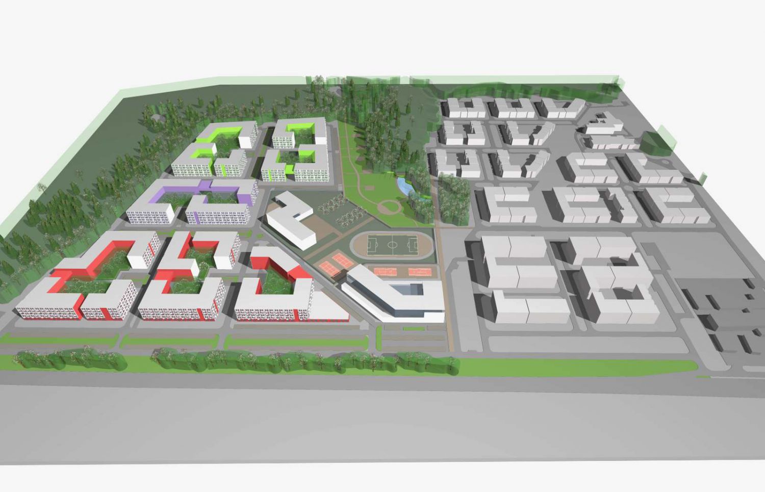 Gorky, Leninsky dst.,Moscow region Condition: Tender project proposal 2017 Parameters: Total space 113 600 m2 apartament space 67 100 m2 school for 550 pupils sports complex 6 000 m2